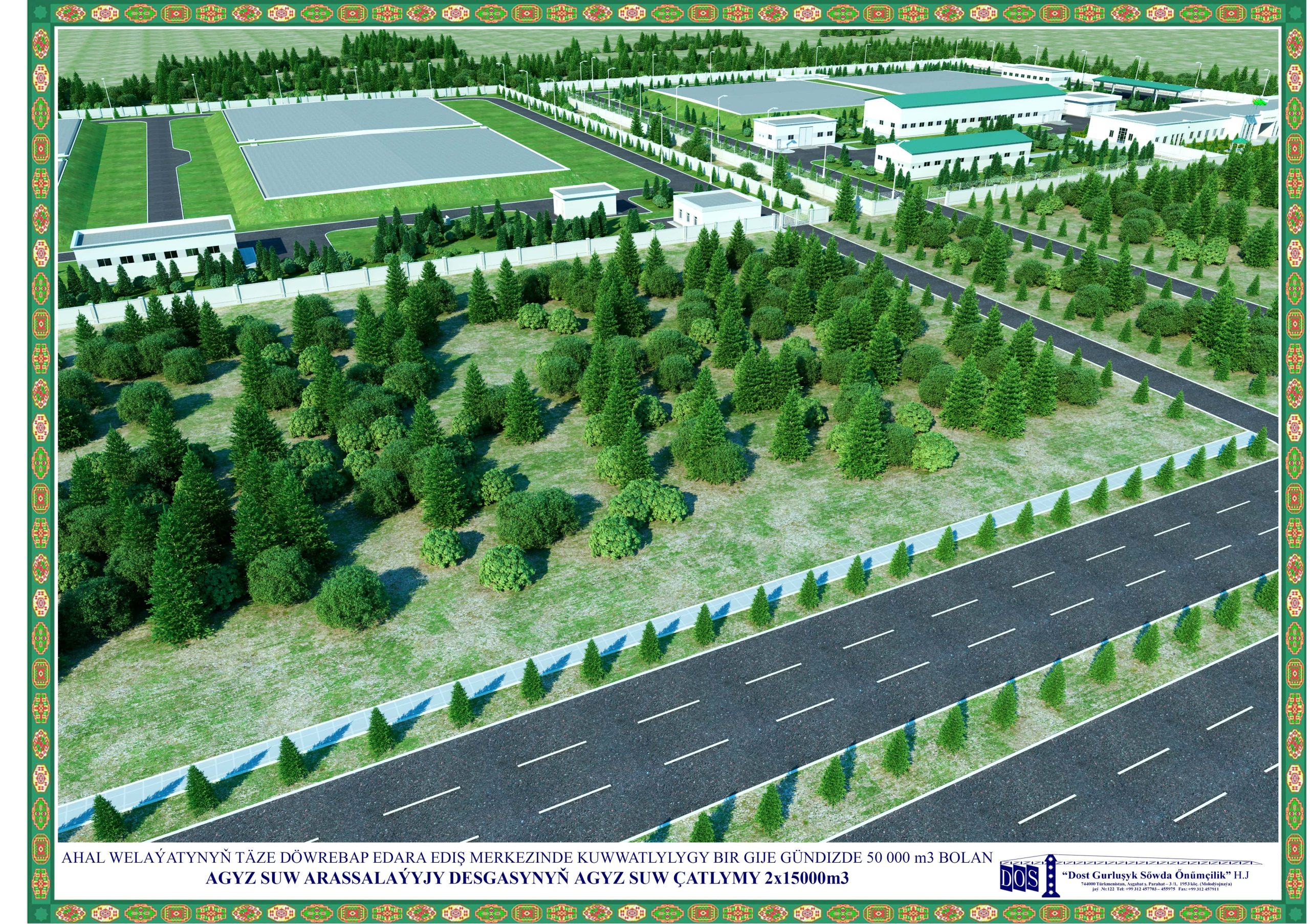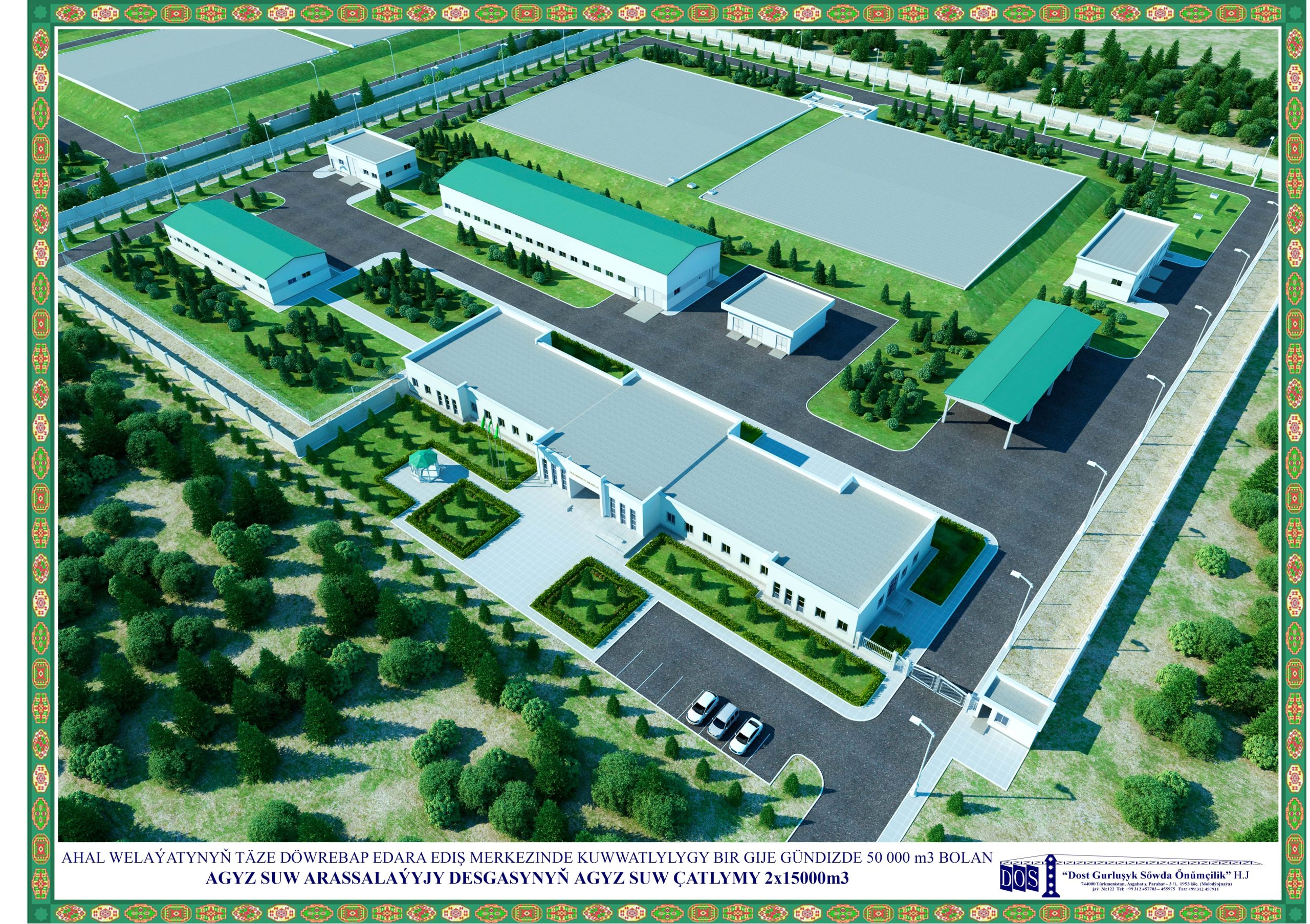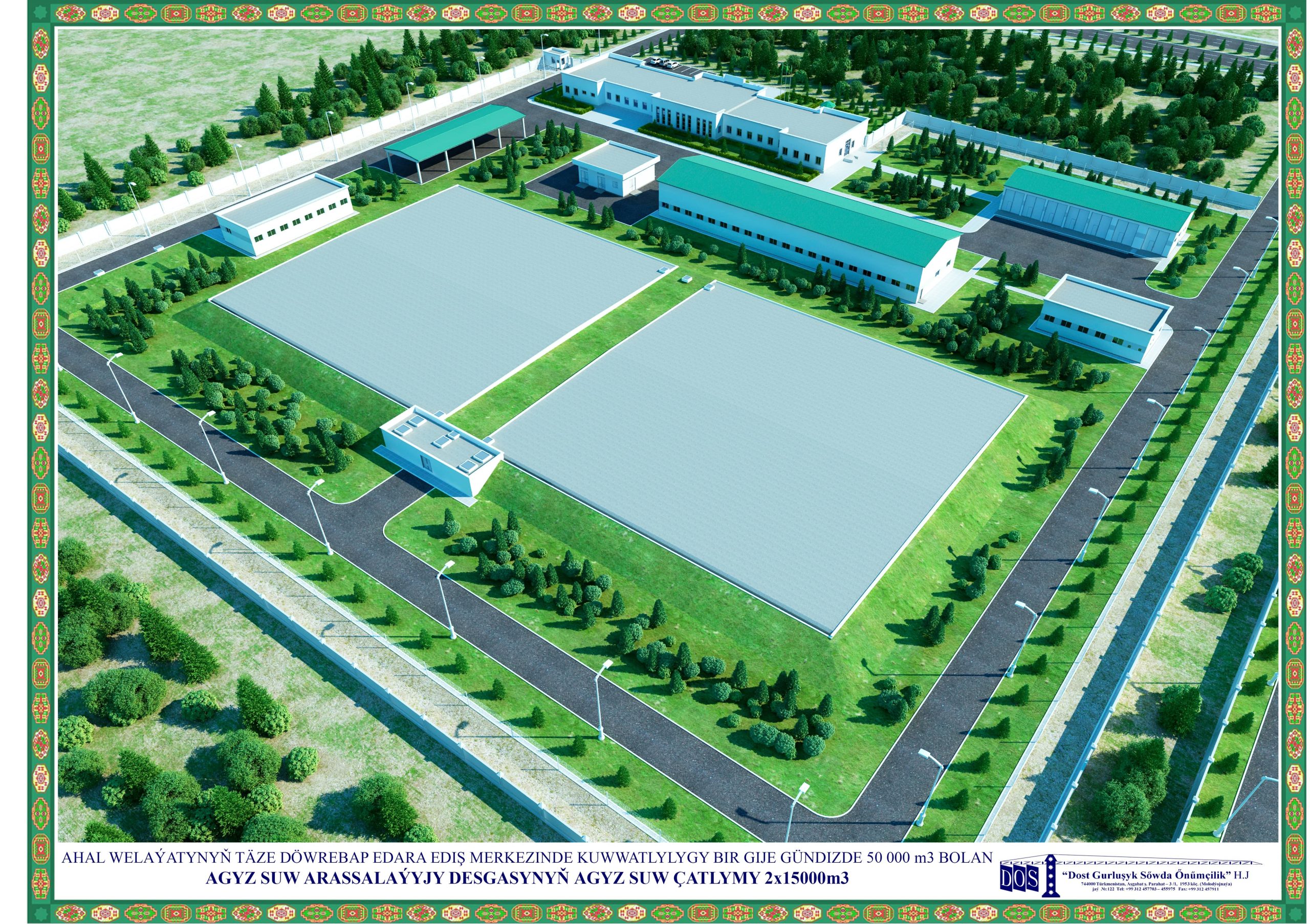 Arkadag şehrinde bulunan, kapasitesi bir gece-gündüzde 50 000 m³ içme suyu arıtma tesisinin inşaatı.