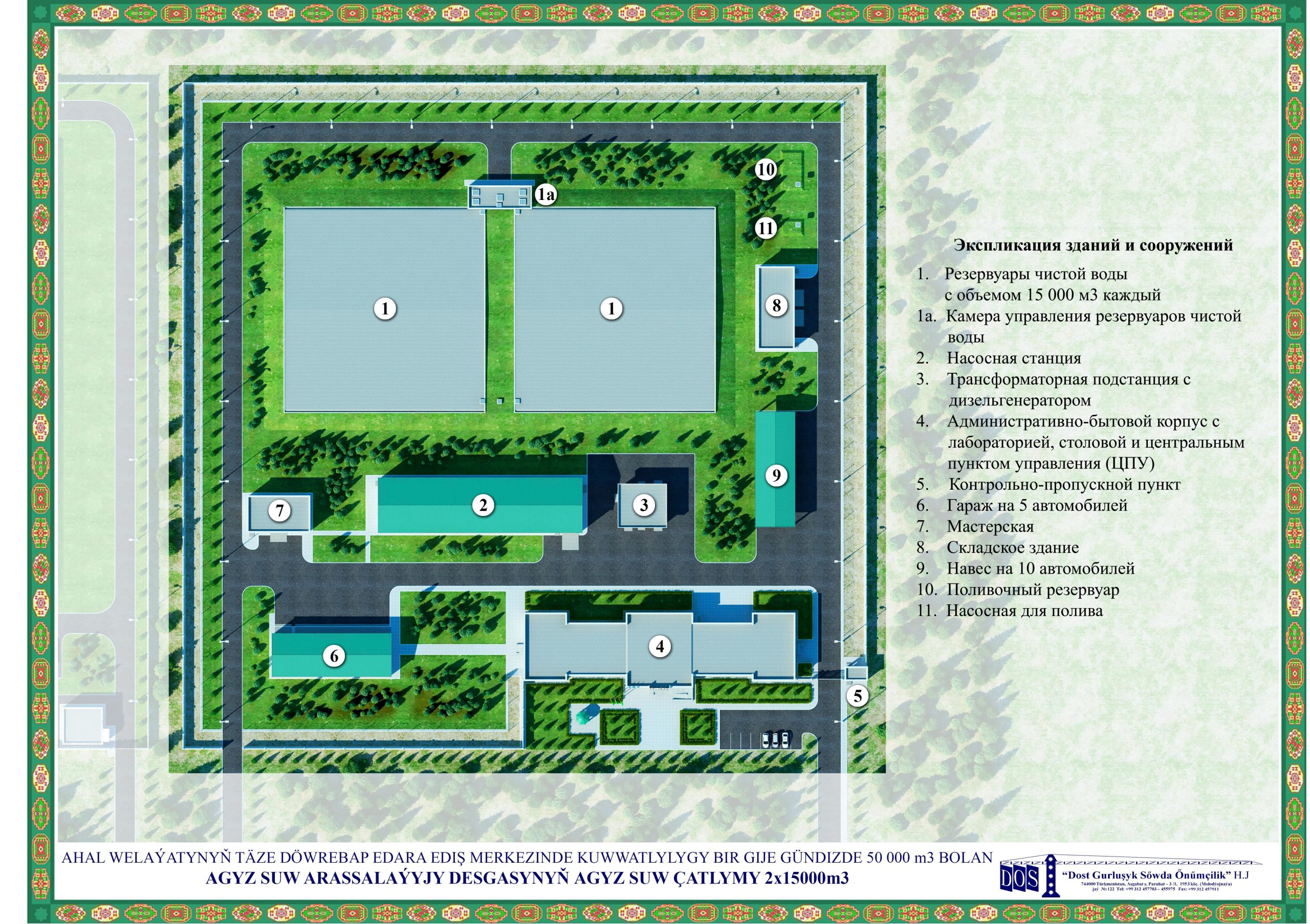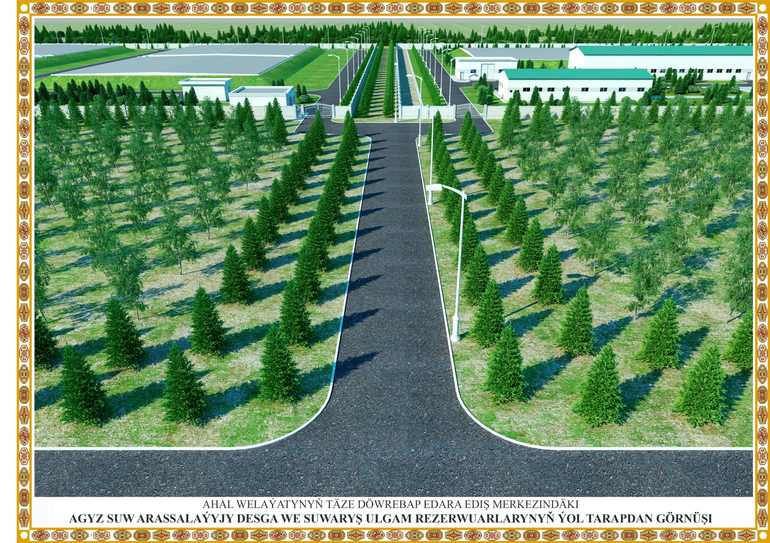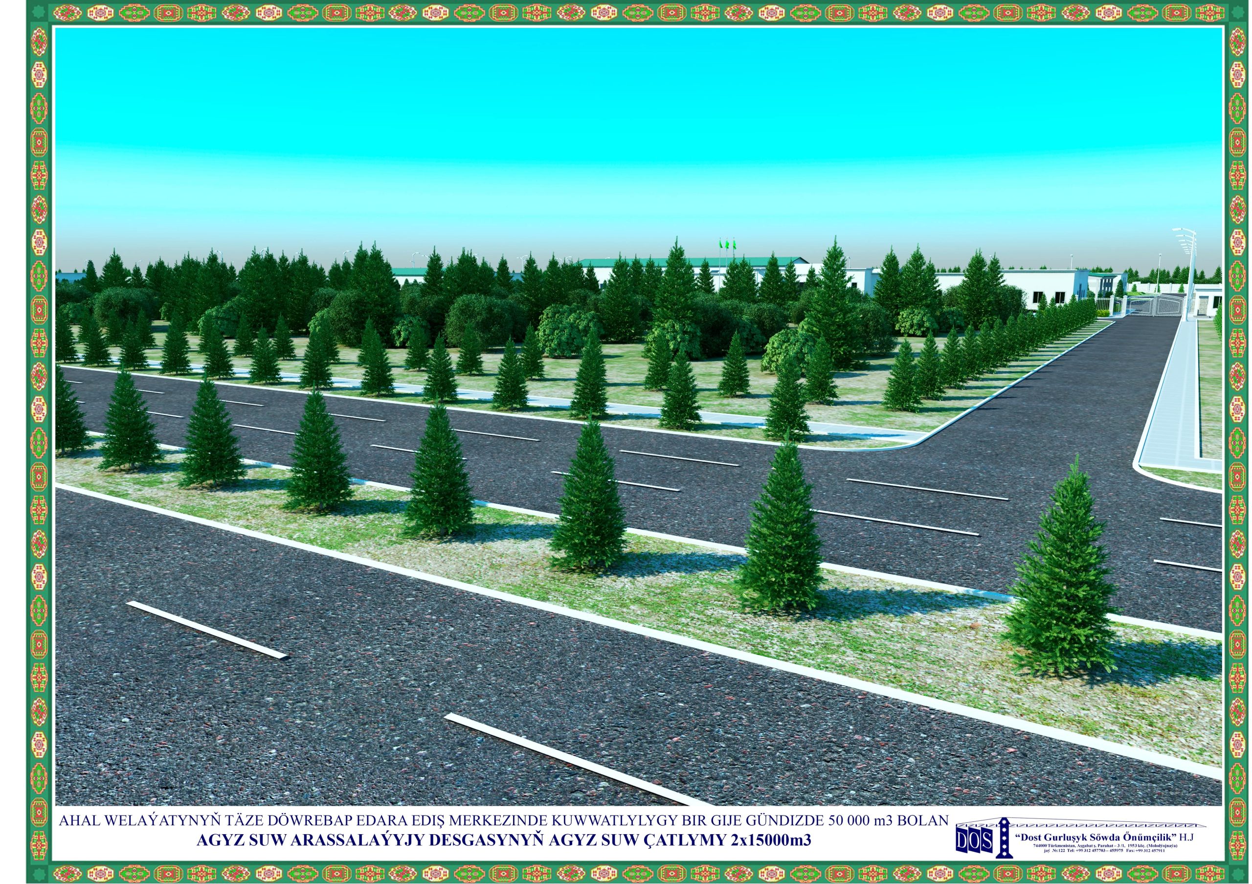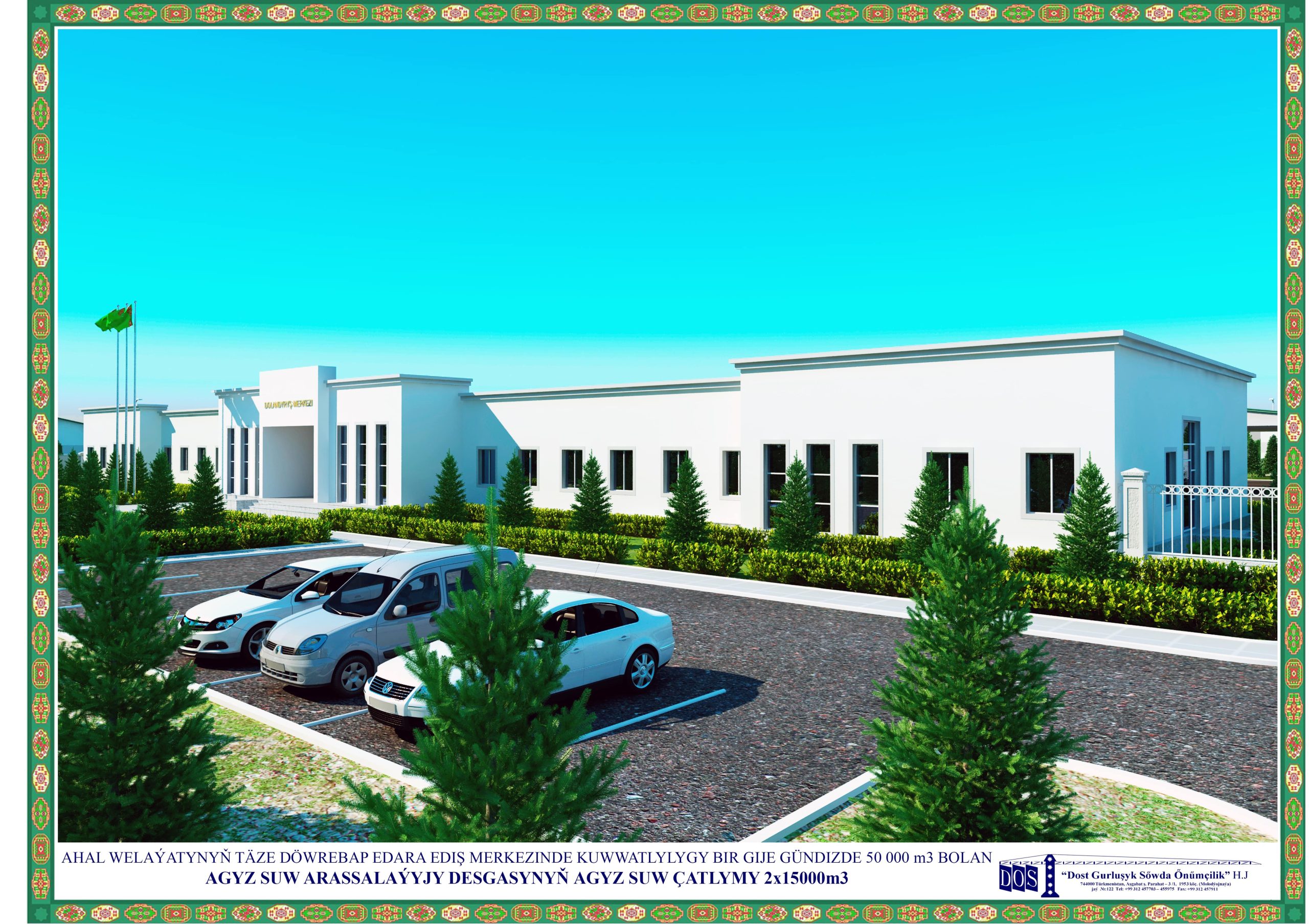 Arkadag şehrinde bulunan, kapasitesi bir gece-gündüzde 50 000 m³ içme suyu arıtma tesisinin inşaatı.